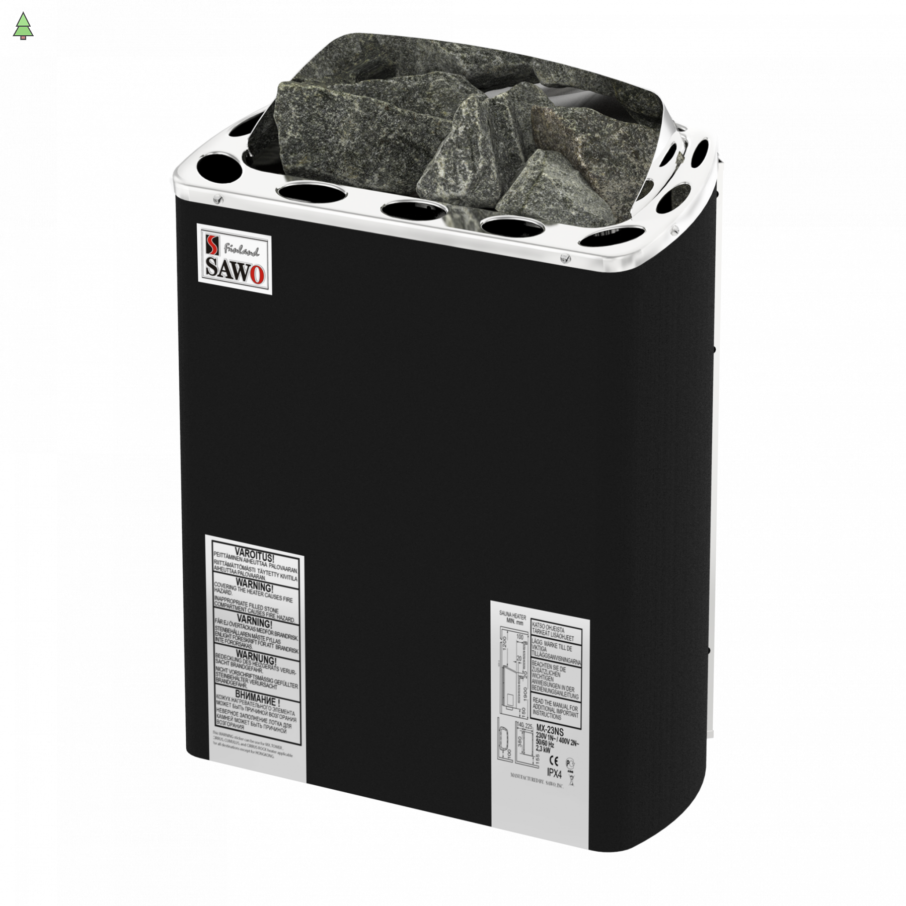 SAWO Электрическая печь Mini X настенная, без блока мощности, 3,6 кВт, нерж. сталь, фибропокрытие, черная, артикул MX-36NS-P-F, выносной пульт (пульт и блок мощности докупаются отдельно)