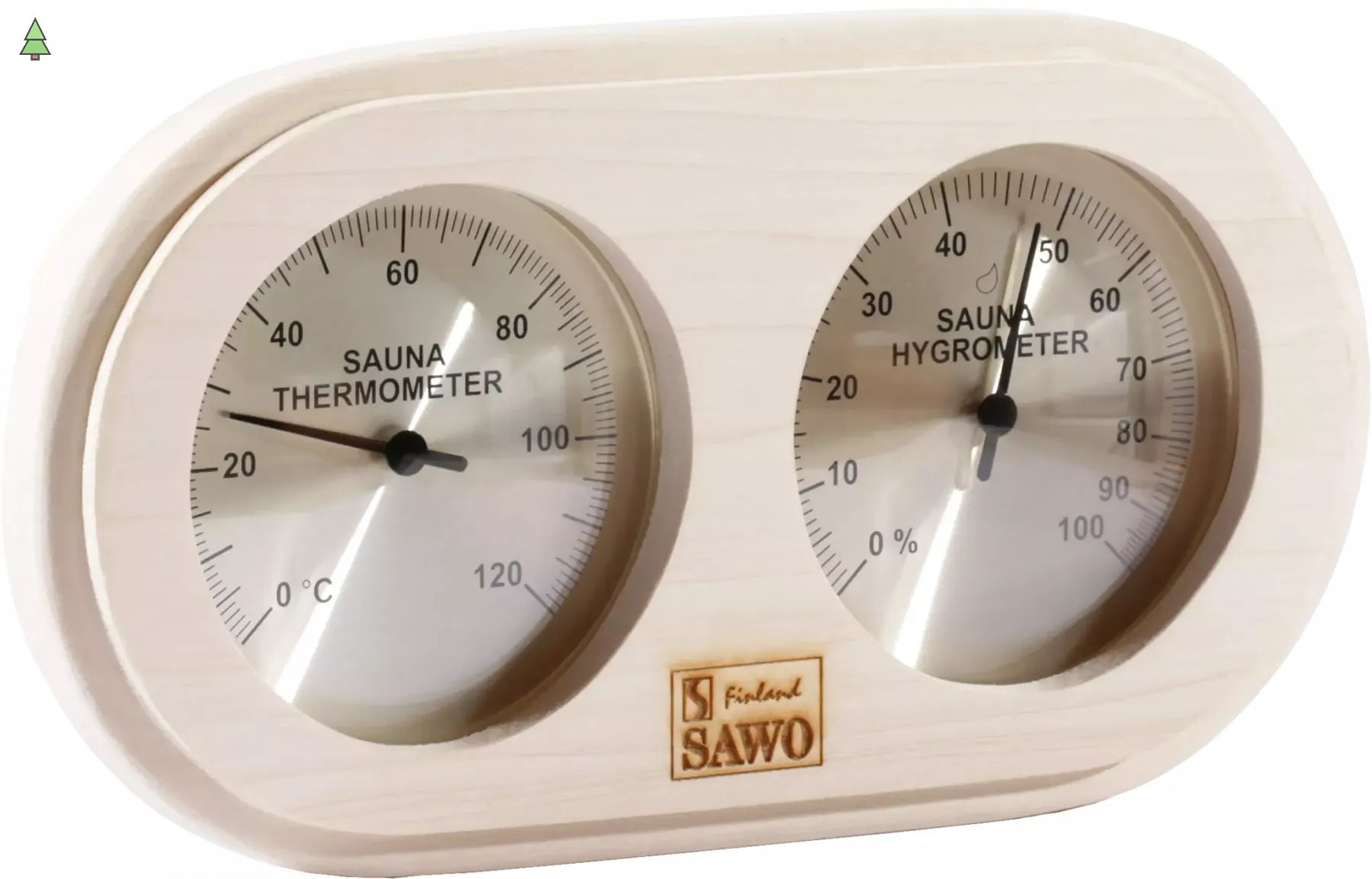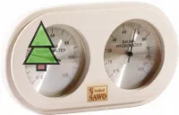 Термогигрометр 222-THА от компании Sawo имеет оригинальную прямоугольную форму со скруглёнными углами. В широкой рамке из древесины осины находится два круглых окошка. Под стеклом каждого окошка расположен графичный циферблат. Один из них - это гигрометр, который с точностью измерит уровень влажности в парной, другой - термометр, который сообщит о температуре воздуха. Данный прибор прекрасно подойдёт для использования в любом парильном помещении.